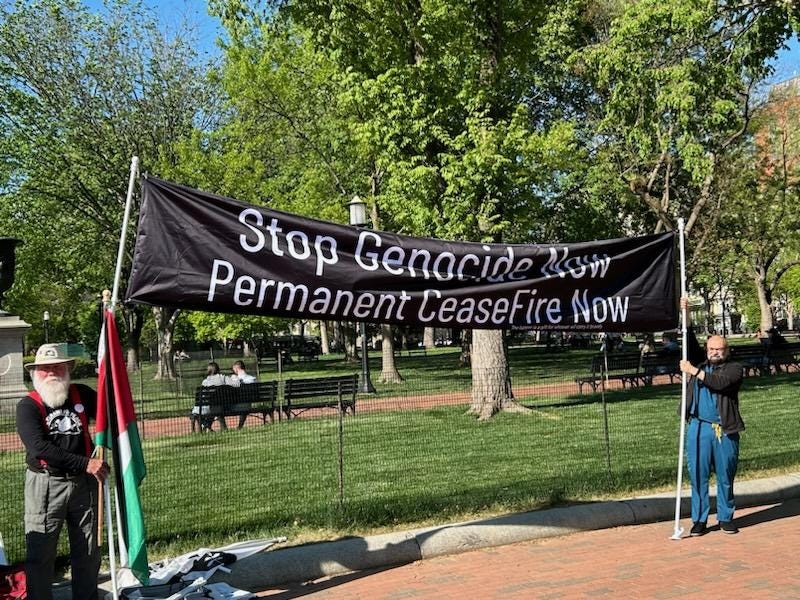 I posted the photo of Al and his comrade holding the banner on Facebook, and as if to demonstrate how concerned the supporters of Israel are about people in the US spreading sentiments like these, the post was besieged by the Hasbara trolls. Around 98% of the comments were from them, and they were blatantly pro-genocide, obviously racist, profoundly anti-Muslim, anti-Arab, anti-Palestinian, and full of lies and crude, dehumanizing rhetoric. In less than 24 hours there have been more than 4,000 comments on the post. I gave up on trying to block and delete all of these people after the first thousand or so. I’ve already blocked and deleted so many thousands of similar posts since late February, but there are always many more.