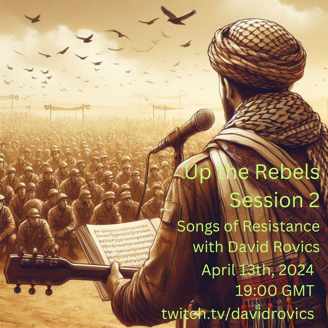 The second episode in the series of presentations from yours truly on the subject of resistance will be streamed live from my living room on Saturday, April 13th at 19:00 GMT (11 am Pacific, 2 pm Eastern). I'll bring you songs and stories about resistance in its many forms, from times past and present. Whichever tales I delve into this time, they'll be different from the ones I got into in session 1...